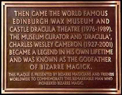 Soon after the death of Charles W. Cameron, many of his friends discussed the possibility of having a plaque erected in the City of Edinburgh as a tribute to this wonderful man regarded as the Godfather of Bizarre Magick. Hopes were for the plaque to be erected on the building or entranceway to what had formerly been the Edinburgh Wax Museum, where Charles had enjoyed being it’s curator during the daytime. During the evening he became 'Dracula' as he played the lead role in his own bizarre and spooky magic show. This show took place in a specially designed auditorium at the Wax Museum and it soon became famous as 'Castle Dracula'. In 2002, it was decided that the actual site of the plaque should be in the entrance passage to the building, formerly the Wax Museum, which lies within a courtyard off the Royal Mile in Edinburgh Old Town. This entranceway at 142 New Assembly Close is perfect as it can easily be seen by all who pass by on this very busy road. Permission to erect a plaque had to meet with City Council approval and many months were spent in contacting all possible departments and officers within the Council. Finally, permissions were received on the understanding that the proposed plaque was to be of an equal size and quality and placed directly below one already on the site. That existing plaque only gave the history of the building prior to the Wax Museum taking over. That meant the plaque to Charles had to be a hefty piece of cast bronze measuring 15 3/4'' Wide X 12'' deep X 1/2'' thick. Equally hefty was the price of this whole project as far more was involved in it than just the making and security fixing the plaque on site. Many of Charles' friends and associates in magic, throughout the world, sent in donations to fund this project. Also, many of his local 'lay people' friends were only to happy to contribute too. Alex Wallace, partner of the late Charles and to whom donations were sent, was taken aback by the sheer kindness and generosity of people sending in money. This turned to amazement and emotional times when people who never met or had any contact with Charles generously came forward with donations. This shows just how much Charles is regarded within the brotherhood of Bizarre Magic and mentalism. Before it's final fixing, a recess was made at the rear of the plaque so that a document containing all the names of the sponsors could be sealed behind it, a 'time capsule' with a difference. Charles IS rightly regarded as the Godfather of Bizarre Magic, without his input, this branch of magic would perhaps not be what it is today and many friendships would not have been made. His writings, performances and published books have been the significant inspiration to many well known performers in this branch of magic such as Anthony Raven, Brother Shadow, Mary Tomich and Tony Andruzzi (lots more too but there is not enough space to mention all). In part of a dedication, Tony Andruzzi (Masklyn ye Mage) wrote in a gift copy of his ''The Negromicon of Masklyn ye Mage (1977)'' to Charles, "the one who started all this". In a copy of Anthony Raven's ''The Necromantic Grimoire Of Augustus Rapp'' gifted to Charles, Raven wrote ''To Charles Cameron-a kindred soul who travels the same paths and whose writings inspired this work''. The plaque is a fitting tribute to Charles and was made by October 2003, in time for the very special Charles W. Cameron Memorial Gathering, which was held during the weekend of the 10th, 11th & 12th October in Edinburgh.