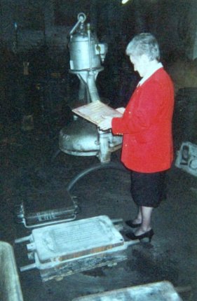 Alex Wallace taking a closer look at the 'pattern' which had just been removed from the newly formed mould which is beside her feet.