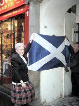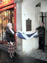 Click on any of the small pictures to view a larger version. Finally, at 7.30 a.m. on the 31st October 2003 (Charles' birth date) the plaque was fixed on site by the makers, Charles Laing & Son of Edinburgh. Firstly, fixing holes had to be drilled and a recess made in the wall. The recess being for a collection of documents including a full list of all those who had donated towards the plaque. Next, the 'time capsule' was put in place and the plaque security fixed on the wall. Andrew Laing had brought along the flag of Scotland for the purpose of another unveiling, done by Alex and Graeme Brodie, the blacksmith working in association with Charles Laing & Sons. This was the culmination of nearly two years effort to bring about this tribute to Charles W. Cameron. Preparation for this started in earnest during May 2003 and could not have been accomplished without many people rallying forth to help fund the project. |